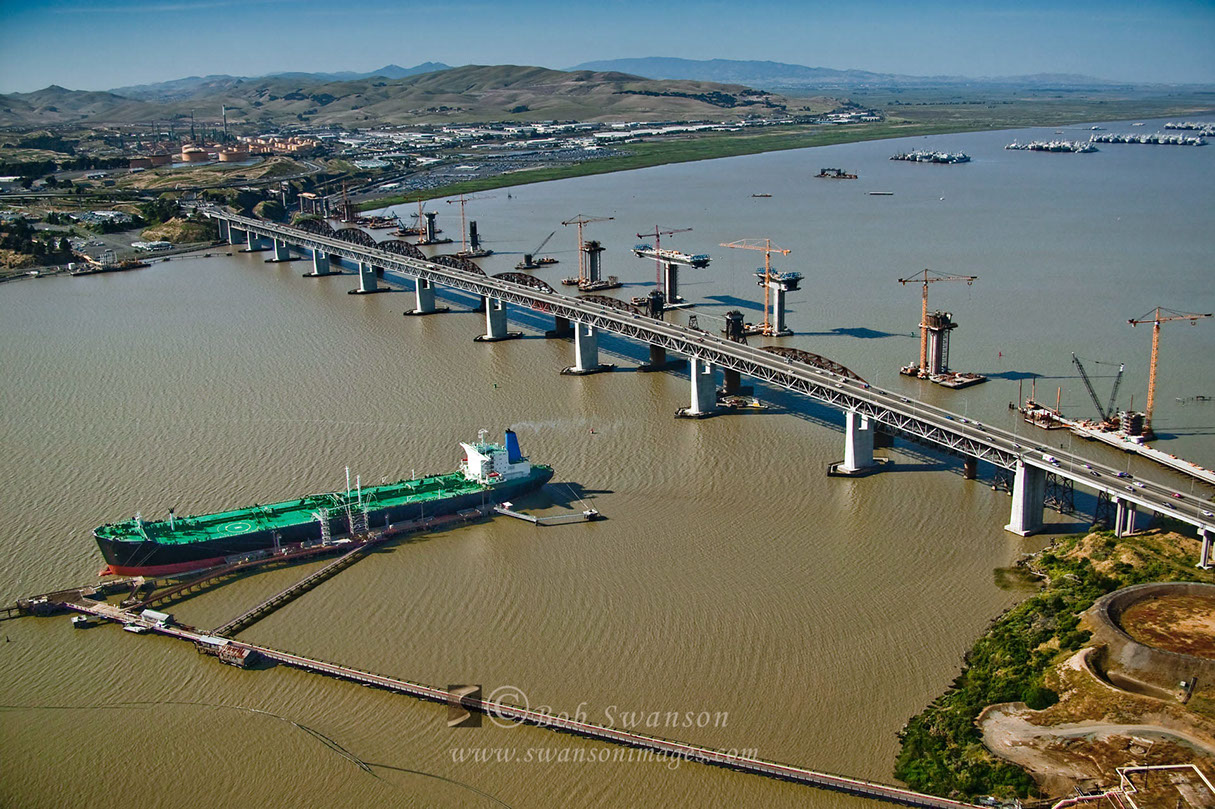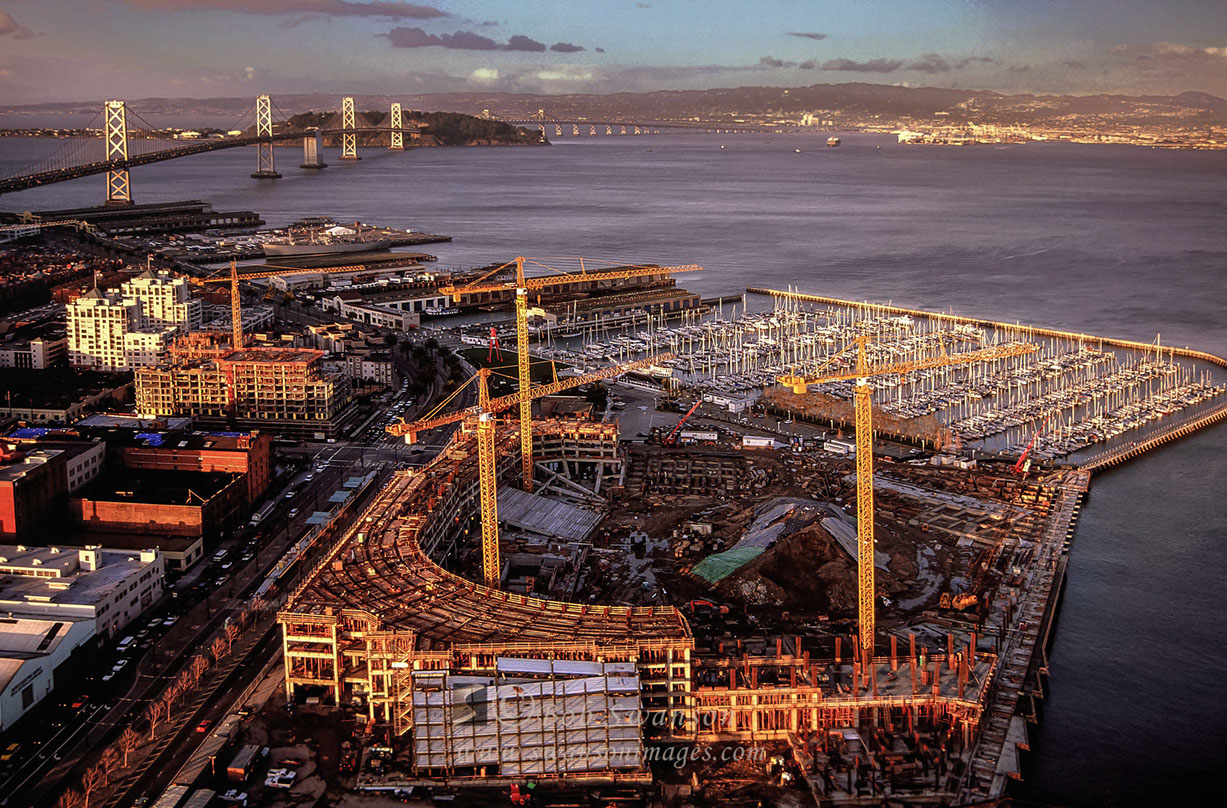 Giant's Stadium under construction, marina and the Bay Bridge.