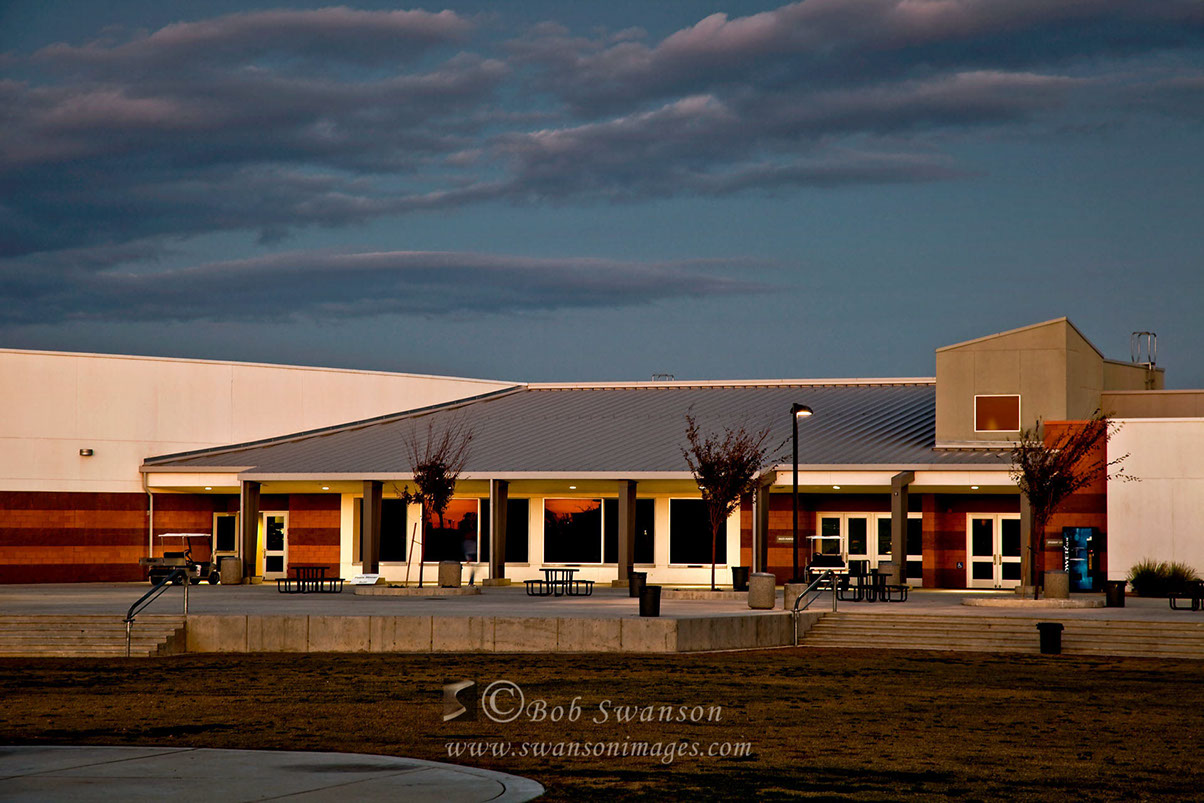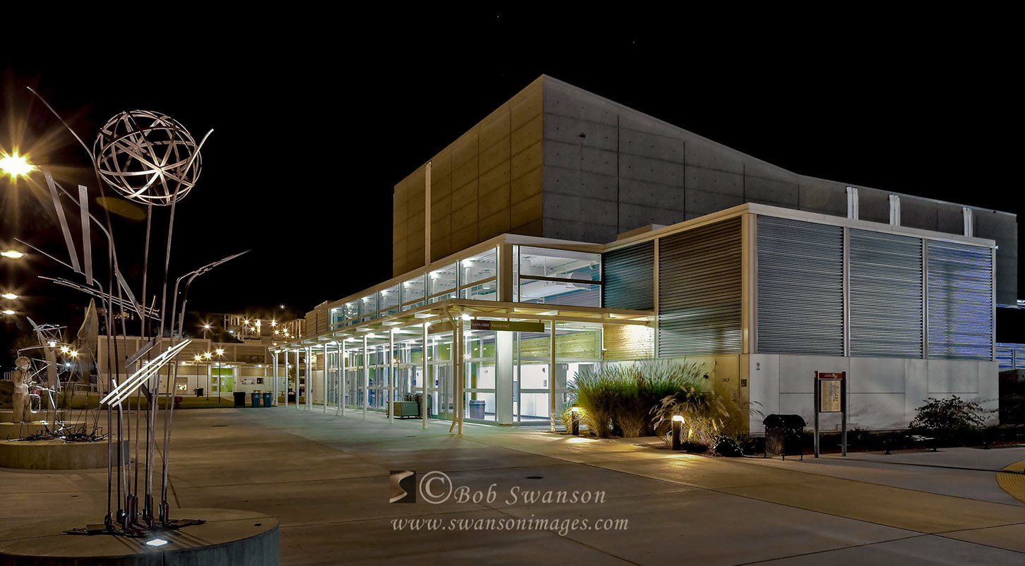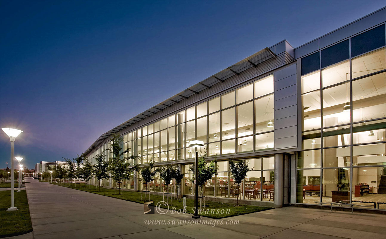Night time at Hartnell Community College Library in Salinas, California for tBP Architects.
