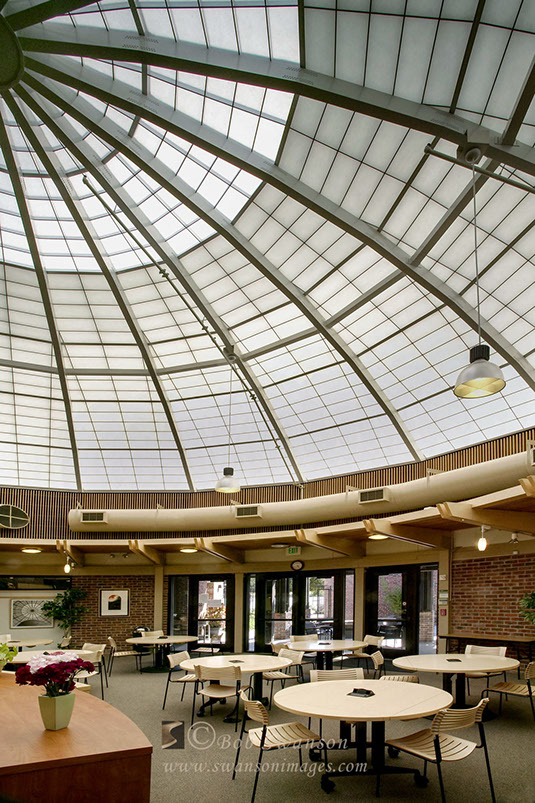 "Eye" ceiling with balcony rails and skylight at Hartnell Community College Library in Salinas, California for tBP Architects.