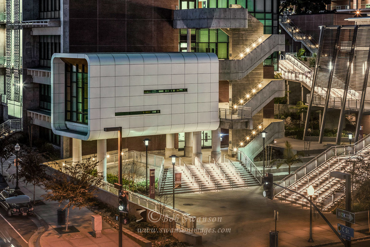 Twilight entry with color changing lights at Mission College Gilmor Center, Santa Clara, California.