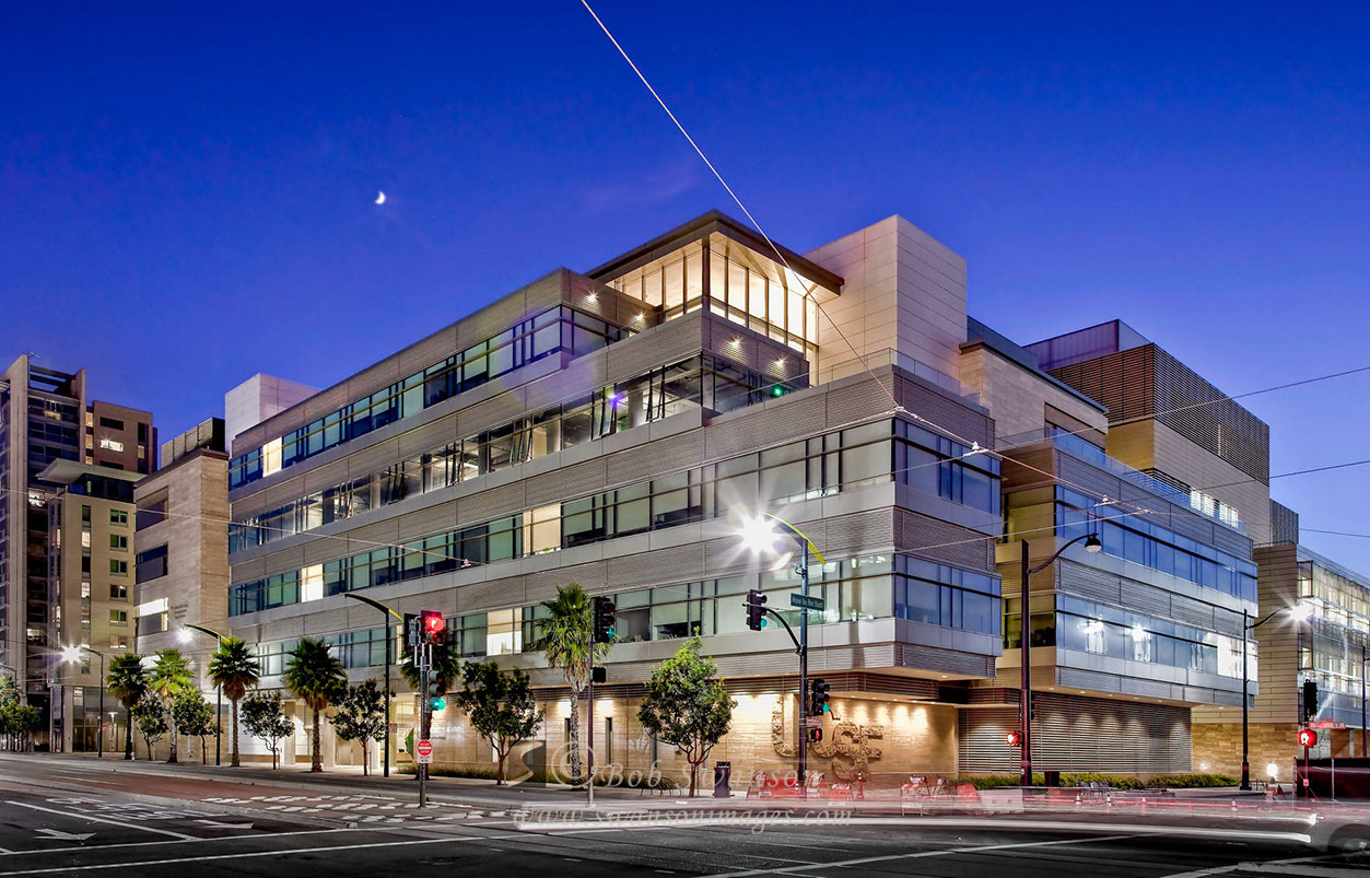 UCSF Helen Diller Cancer Research Center and San Francisco downtown twilight skyline.