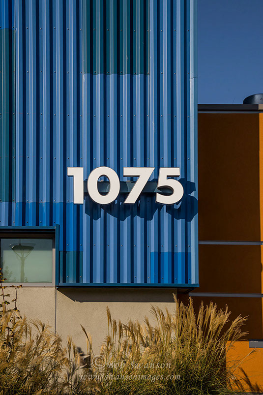 Blue corrugated siding twilight detail of the West Sacramento Community Center, California.