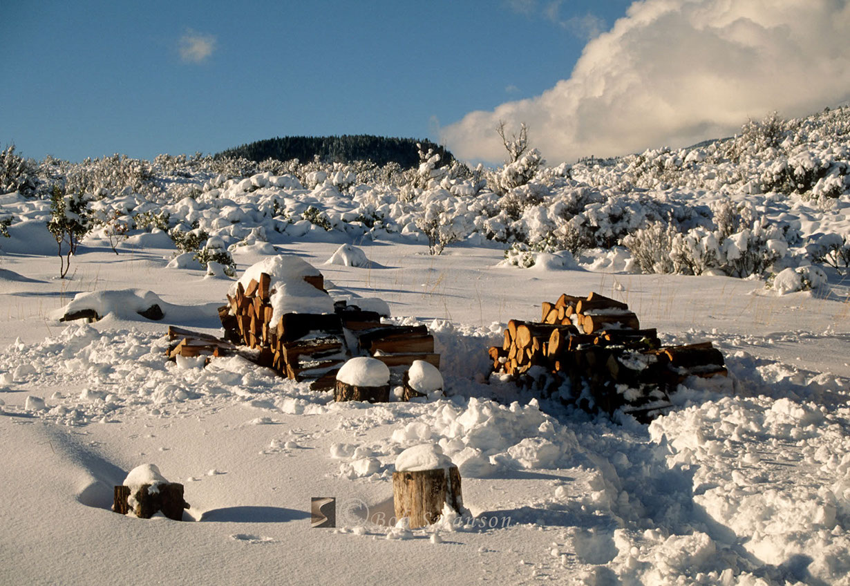 Snowy woodpile.