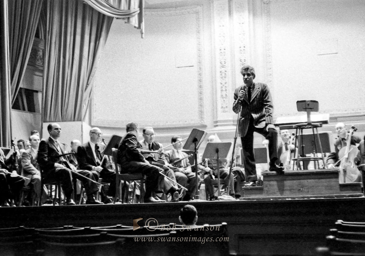Leonard Bernstein conducting a free open rehearsal of the New York Philharmonic at Carnegie Hall.