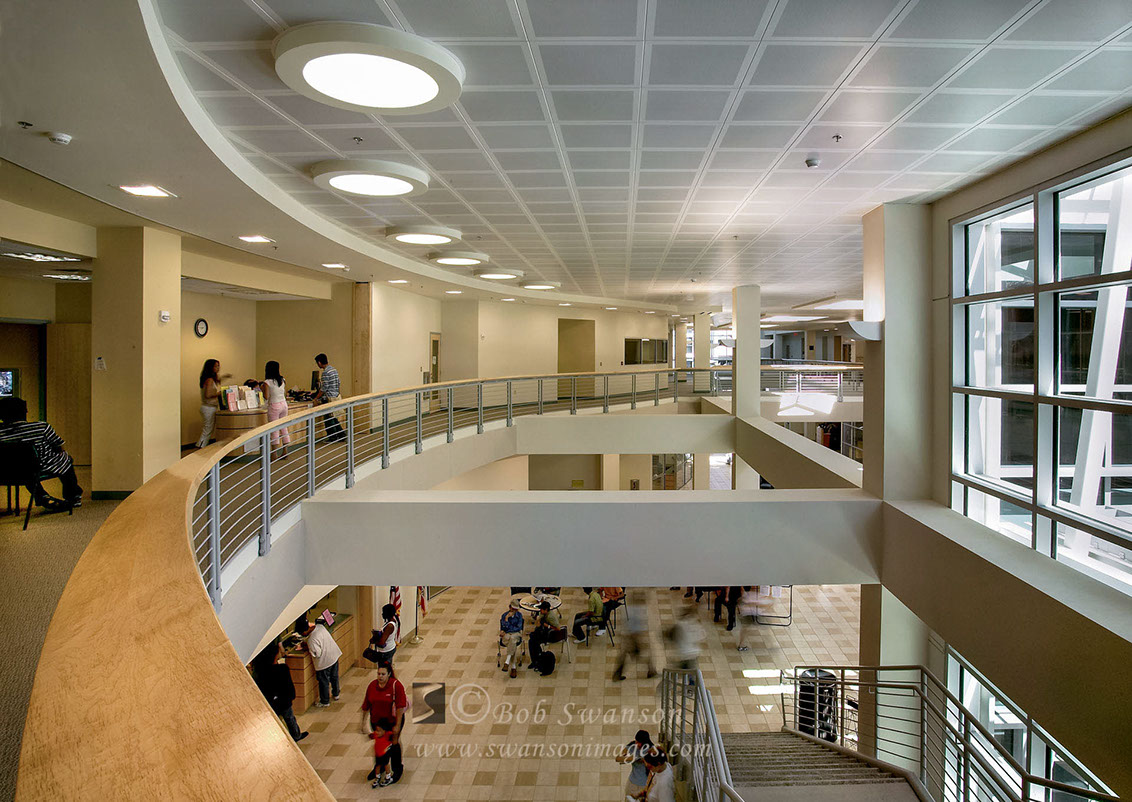 "Eye" ceiling with balcony rails and skylight at Hartnell Community College Library in Salinas, California for tBP Architects.