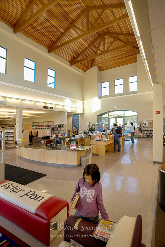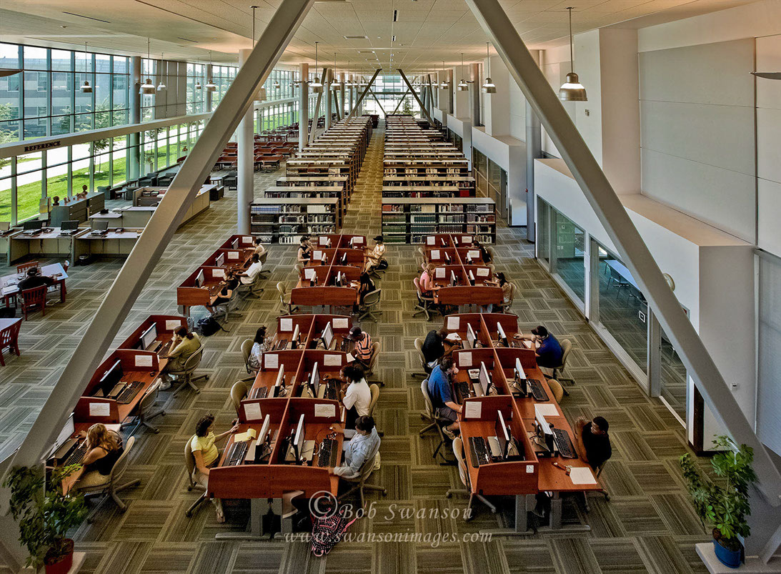 Balcomy interior of Hartnell community college library in Salinas, California for tBP Architects.