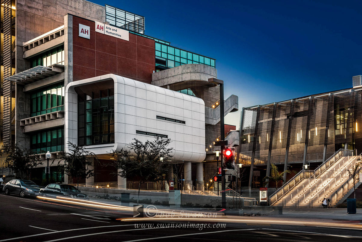 Night time at Hartnell Community College Library in Salinas, California for tBP Architects.