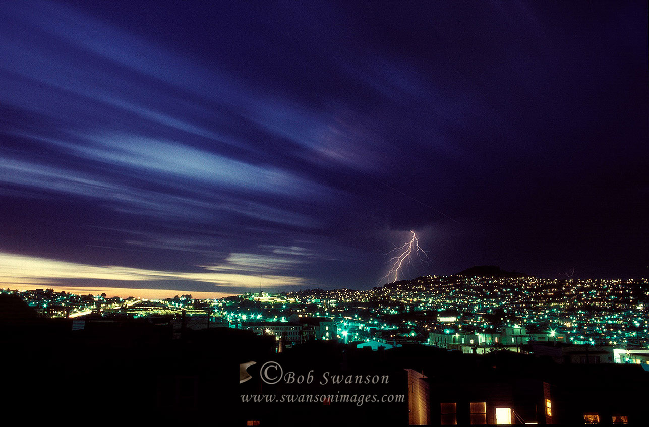 Sunset Lightning, cloud streaks over City College, San Francisco