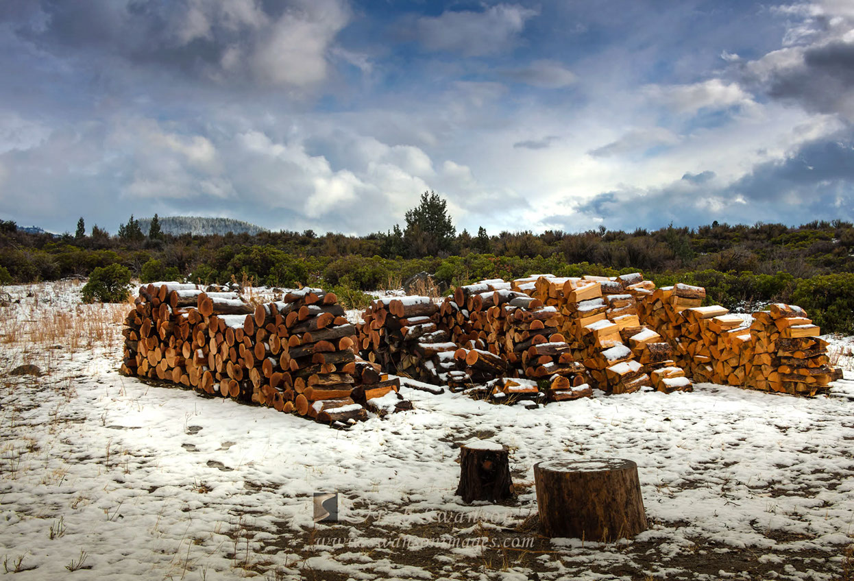 Snowy woodpile.