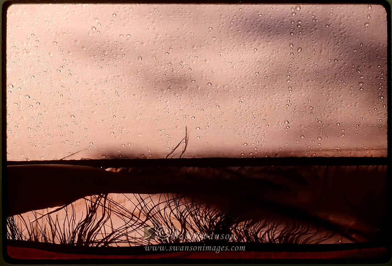 In a wet tent with rose colored glasses on at sunset.
