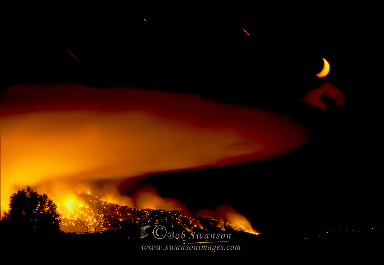 Forest fire, crescent moon and star streaks.