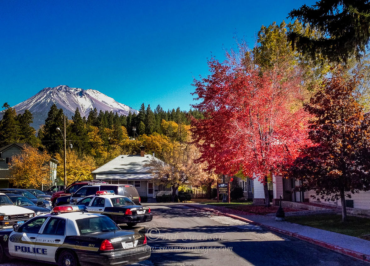 Weed City Hall, Mount Shasta and autumn foliage.